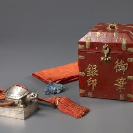 Silver Seal: H. 9.5 X W. of handle 6.5 X L. of handle 13.0 X W. of body 10.2 X D. of body 10.2 X L. of tie 94.8cm, Seal Case: W. 20.0 X D. 20.0 X H. 27.1cm, Royal Instruction: W. 178.0 X H. 69.5cm